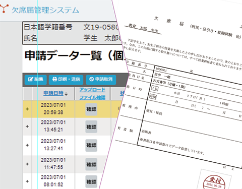 本システムは、欠席届をはじめ、さまざまな申請書類を自動化し、事務作業の軽減を実現します。